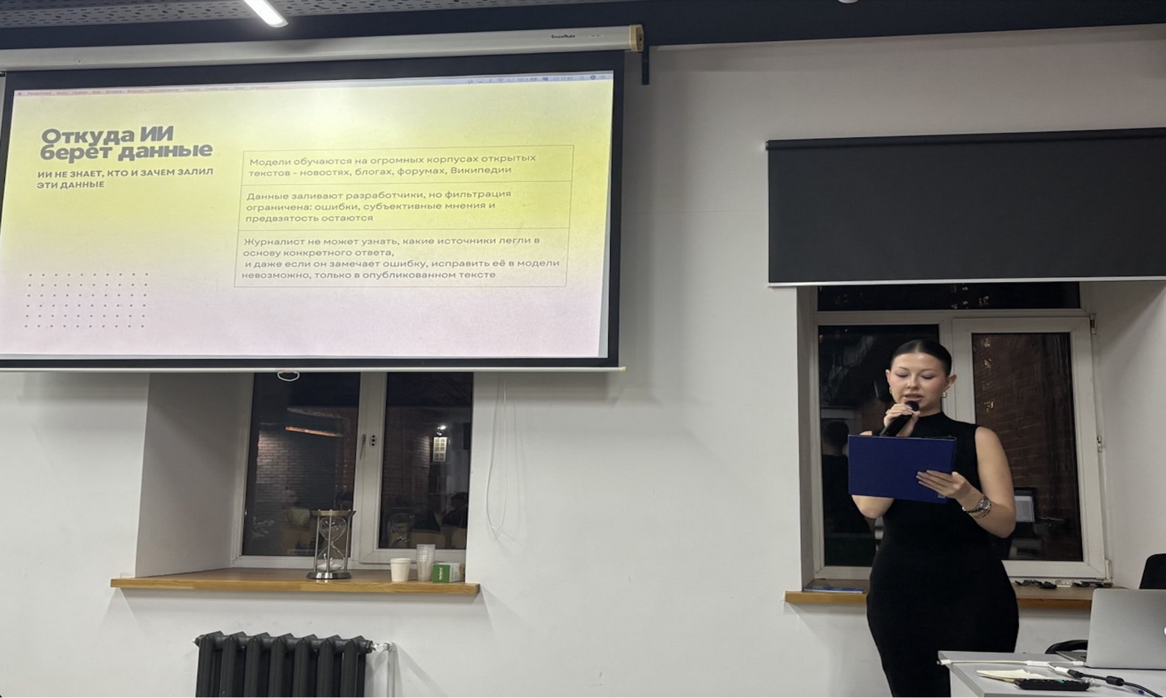 Конференция стала площадкой для активного обсуждения вопросов, связанных с влиянием технологий искусственного интеллекта на современную журналистику. Один из важных вопросов был поднят в докладе студентки факультета журналистики ГИТРа Анастасии Загировой «Можно ли доверять?».